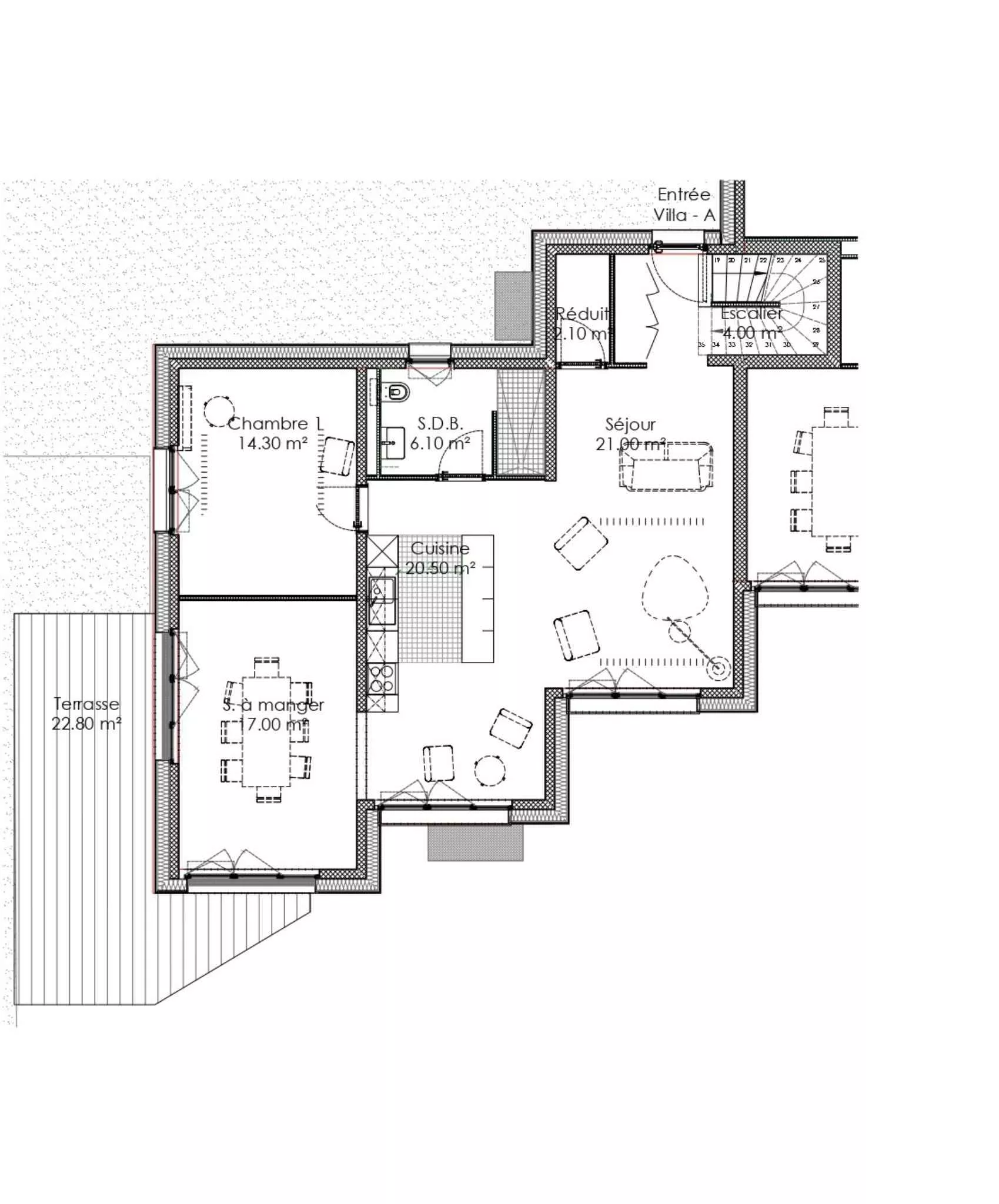 La villa dispose également d'un parking souterrain avec deux places de stationnement et de 2 places visiteur extérieures en commun avec la villa B, d'une cave, d'une buanderie ainsi qu'un espace aménageable au sous-sol, assurant un confort d'utilisation au quotidien. Les aménagements extérieurs ont été pensés pour favoriser la convivialité et la mobilité douce, avec une place de jeux commune et un parking vélos.