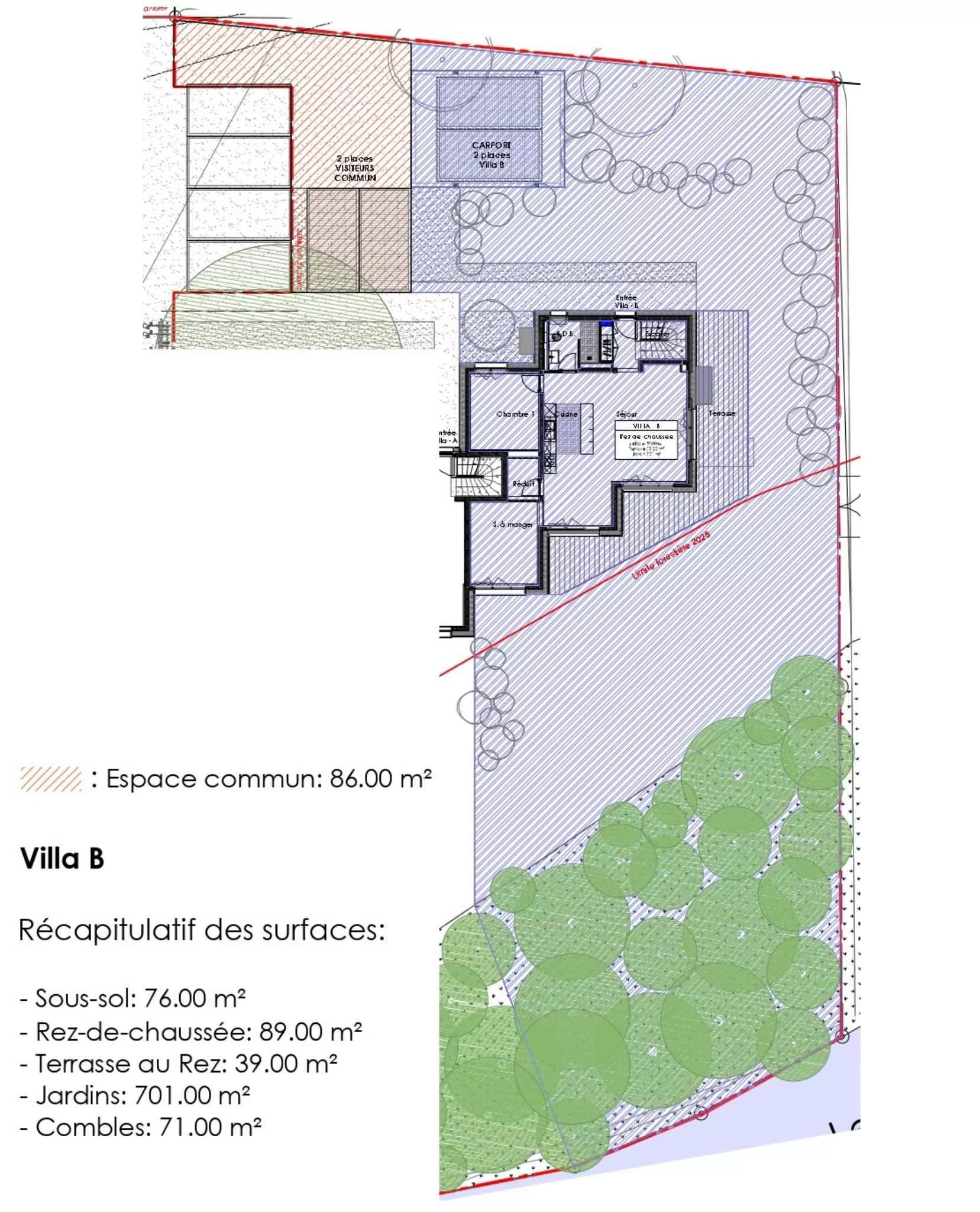 La villa dispose également de deux places de stationnement couvertes et deux places visiteur extérieures en commun avec la villa A, d'une cave, d'une buanderie ainsi qu'un espace aménageable au sous-sol, assurant un confort d'utilisation au quotidien. Les aménagements extérieurs ont été pensés pour favoriser la convivialité et la mobilité douce, avec une place de jeux commune et un parking vélos.