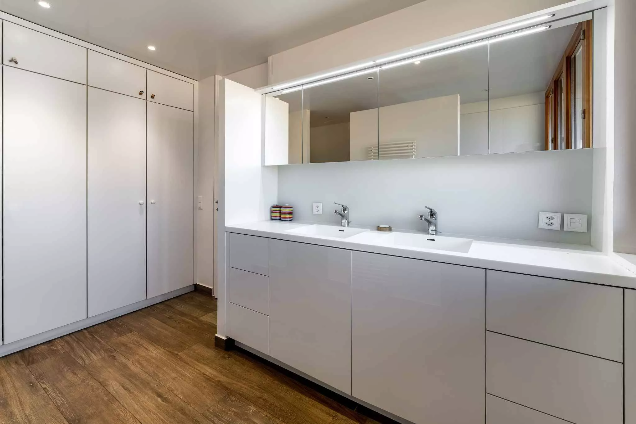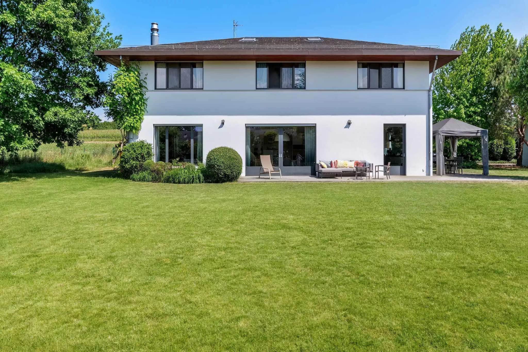 La villa se développe sur trois niveaux hors sol, complétés par un sous-sol. Au rez-de-chaussée, les pièces de vie très lumineuses s'ouvrent sur le jardin et les terrasses. Le premier étage accueille cinq chambres à coucher, dont une belle suite parentale avec salle de douche attenante. Les combles ont été aménagées en une grande salle polyvalente, parfaite comme salle de jeux, bureau ou espace de loisirs.