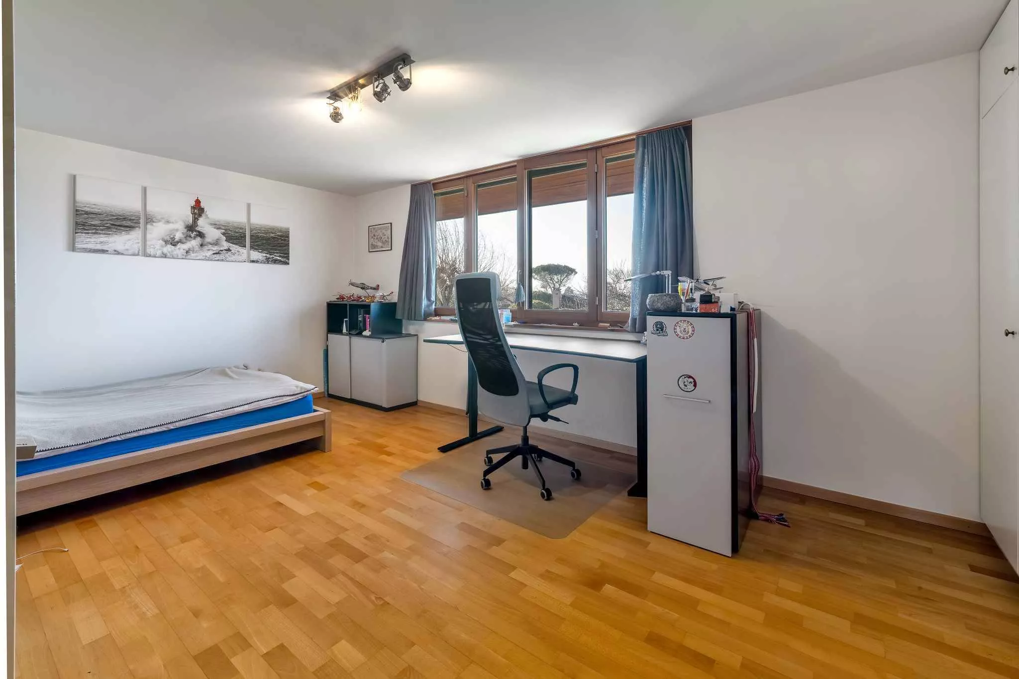 La villa se développe sur trois niveaux hors-sols, complétés par un sous-sol. Au rez-de-chaussée, les pièces de vie spacieuses et lumineuses s'ouvrent sur le jardin et les terrasses. Le premier étage accueille cinq chambres à coucher, dont une belle suite parentale avec salle de douche attenante. Les combles ont été aménagées en une grande salle polyvalente, parfaite comme salle de jeux, bureau ou espace de loisirs.